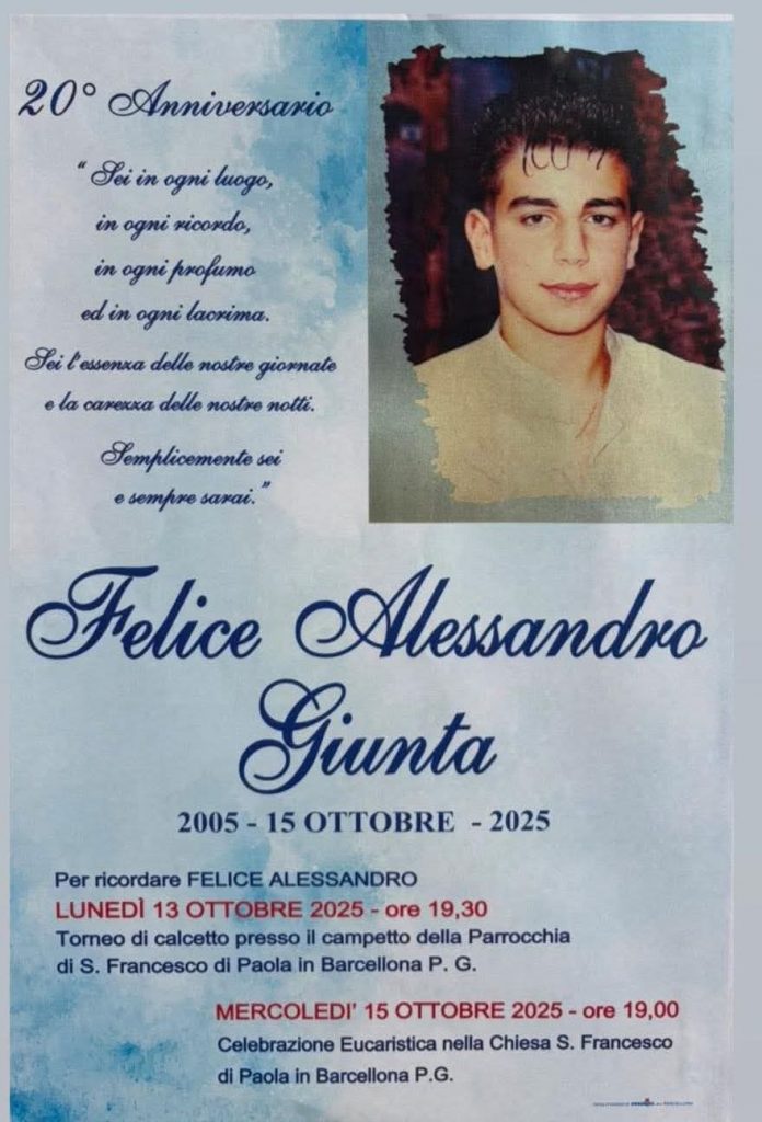 Barcellona Pozzo di Gotto (ME) – Sono trascorsi vent’anni, ma il dolore e l’appello alla giustizia sociale restano più vivi che mai. Oggi, 15 ottobre 2025, Barcellona Pozzo di Gotto commemora il 20° anniversario della tragica scomparsa di Felice Sebastiano Giunta, il quindicenne strappato alla vita nel 2005 da un brutale atto di bullismo. Felice, all’epoca studente del Liceo Scientifico “E. Medi”, è diventato, suo malgrado, il simbolo della lotta contro la violenza giovanile e il bullismo che affligge le scuole e le comunità.