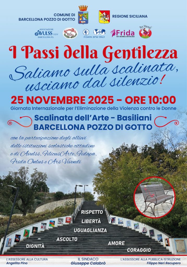 In occasione della Giornata Internazionale per l’eliminazione della violenza contro le donne, si terrà domani 25 novembre 2025 alle ore 10:00 presso la Scalinata dell’Arte-Basiliani in Barcellona Pozzo di Gotto, una manifestazione per sensibilizzare la cittadinanza sulla grave problematica di questi nostri tempi.