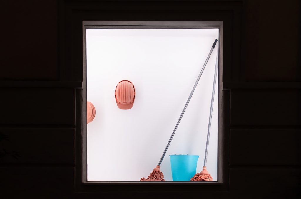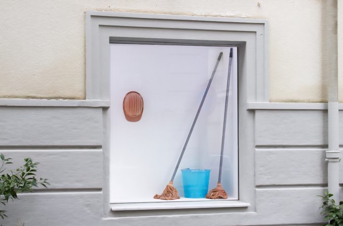 Nell’angolo della stanza, un mocio in ceramica e dei caschetti appesi alle pareti rompono l’illusione museale. Richiamano il lavoro manuale, il sudore della creazione e l’ambiguità del reale. È un omaggio all’incuria delle zone abbandonate della città e, allo stesso tempo, alla loro rinascita attraverso l’arte. Quello che per molti è “sgretolamento”, per Polloniato è una forma fisica del pensiero.