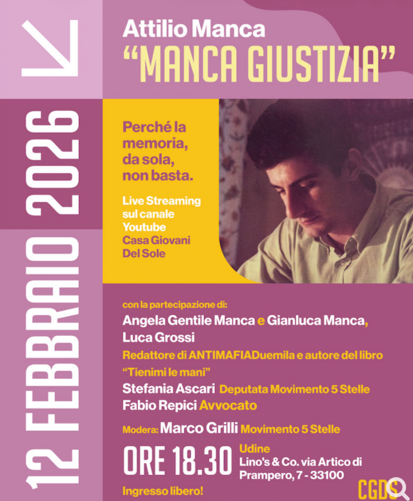 Proprio per rompere il muro di silenzio che ancora avvolge il caso, oggi 12 febbraio, Udine diventa il centro della mobilitazione nazionale. Presso il Lino’s & Co. (via Artico di Prampero), si tiene l’incontro “Manca Giustizia. Perché la memoria da sola non basta”. L’evento, organizzato dal collettivo “Casa Giovani del Sole”, vede la partecipazione di Angela Gentile Manca e il figlio Gianluca Manca; la deputata Stefania Ascari e l’avvocato Fabio Repici (in video intervento); Luca Grossi, autore del libro d’inchiesta “Tienimi le Mani”.