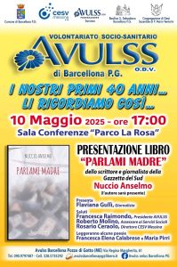 Continuano i festeggiamenti dell’Avulss Barcellona Pozzo di Gotto per i 40 anni dalla nascita dell’associazione nella città del Longano e la Presidente Francesca Raimondo organizza per sabato 10 maggio 2025 alle ore 17.00 presso l’Auditorium del Parco Urbano “Maggiore La Rosa” la presentazione di “Parlami madre” testo dello scrittore e giornalista Nuccio Anselmo.
