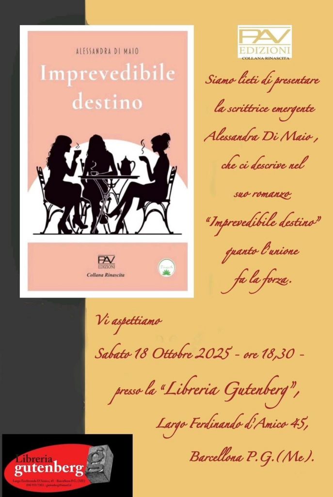 Interessante evento culturale sabato prossimo 18 ottobre 2025 a Barcellona Pozzo di Gotto: nella Libreria Gutenberg di Largo Ferdinando D’Amico 45 si terrà la presentazione del romanzo “Imprevedibile destino”, recente pubblicazione della scrittrice Alessandra Di Maio.