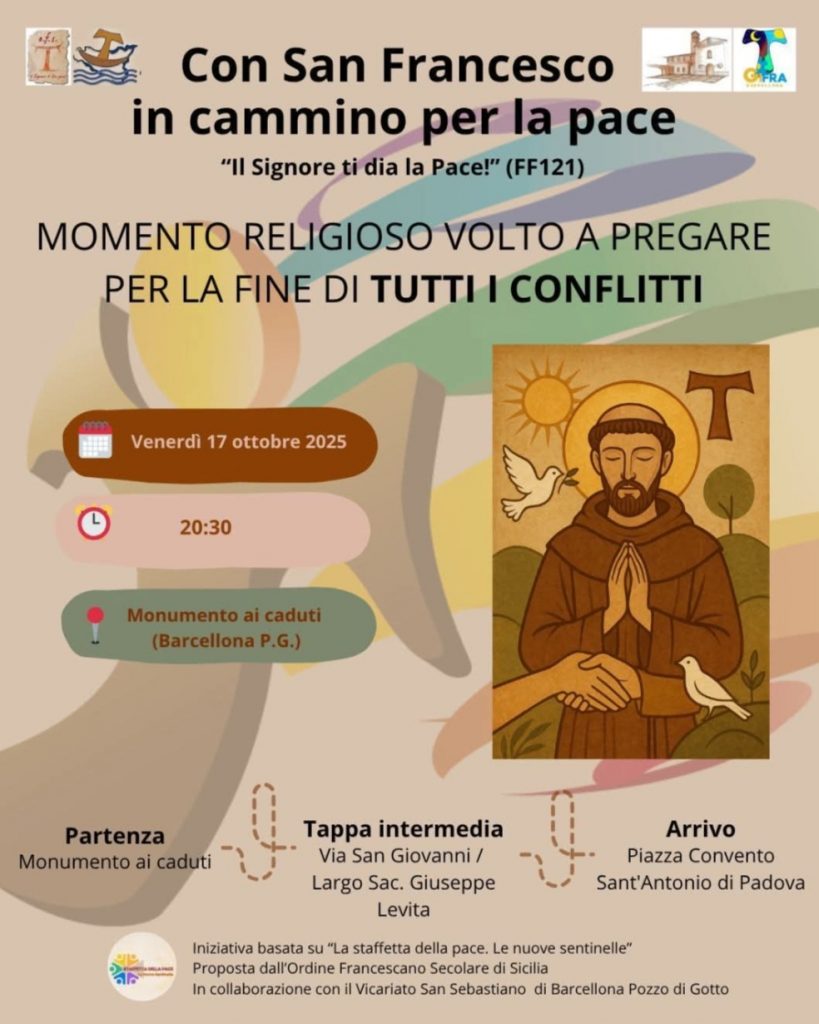 Prenderà avvio alle ore 20.30 di venerdi 17 ottobre 2025 dal Monumento ai Caduti di Barcellona Pozzo di Gotto, una fiaccolata silenziosa organizzata dall’Ordine Francescano Secolare e dal Vicariato San Sebastiano, contro tutte le guerre. Dopo una tappa intermedia, in Via San Giovanni, Largo Sac. Giuseppe Levita, si giungerà in Piazza Convento, cuore del quartiere di Sant’Antonino.