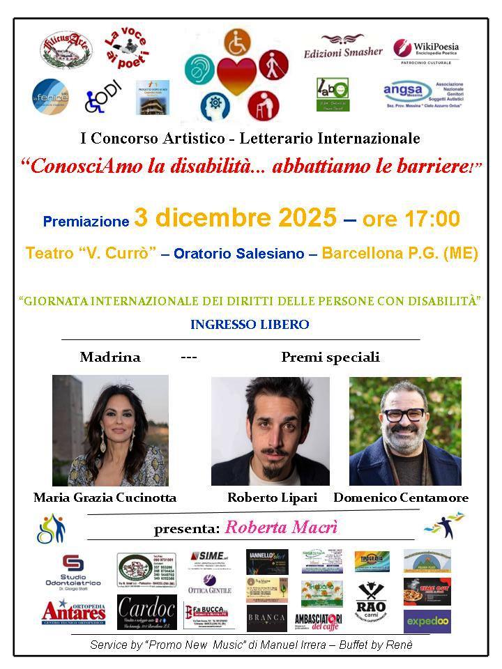 Mercoledì 3 dicembre si svolgerà presso il Teatro “Vittorio Currò – Oratorio Salesiano” in Barcellona P.G., a partire dalle ore 17:00, la serata di premiazione della I edizione del Concorso Artistico – Letterario Internazionale “ConosciAmo la disabilità… abbattiamo le barriere!”, indetto dal gruppo “La Voce ai Poeti” di Barcellona, sotto l’egida dell’Associazione Culturale milazzese “FilicusArte” e della casa editrice barcellonese “Smasher”.