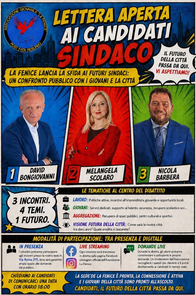 L’Associazione Giovanile La Fenice lancia un’iniziativa di partecipazione civica rivolta ai giovani e all’intera cittadinanza, con l’obiettivo di creare un confronto diretto, concreto e trasparente con i candidati alla carica di Sindaco della città di Barcellona Pozzo di Gotto.