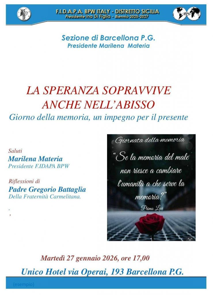 Non un semplice esercizio di retorica, né un rituale stanco per adempiere a un calendario civile, ma un vero e proprio “laboratorio di pace”. In occasione della Giornata della Memoria, la sezione cittadina della Fidapa BPW-Italy presieduta dalla Prof.ssa Marilena Materia, lancia un forte segnale alla comunità con l’incontro dal titolo emblematico: “La speranza sopravvive anche nell’abisso – Giorno della memoria, un impegno per il presente”.