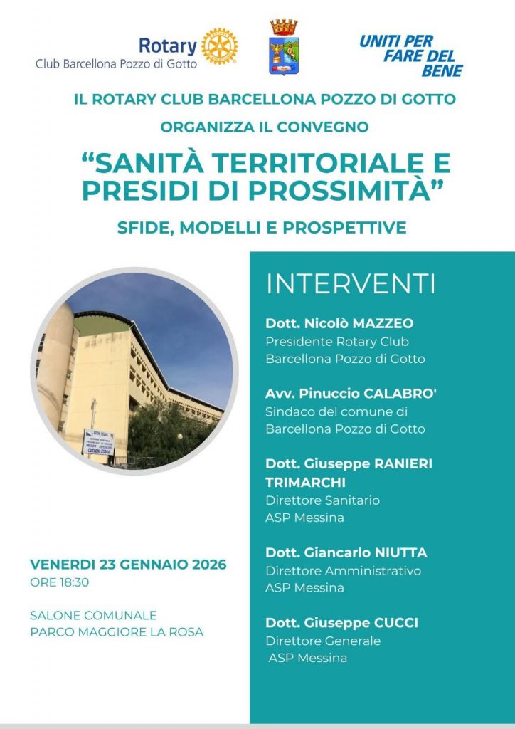 Accorciare le distanze tra il cittadino e il diritto alla cura. È questo l’obiettivo ambizioso del convegno informativo “Sanità territoriale e presìdi di prossimità”, organizzato dal Rotary Club di Barcellona P.G., che si terrà venerdì 23 gennaio 2026 alle ore 18:30 nell’Auditorium del Parco “Maggiore La Rosa”.