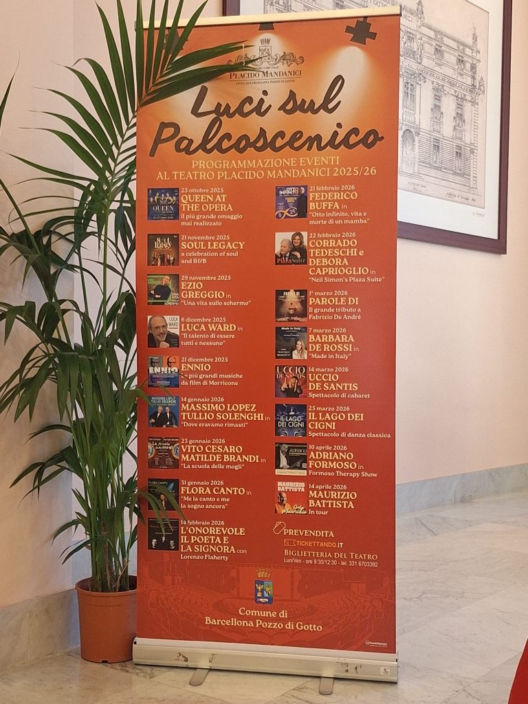 Barcellona Pozzo di Gotto (ME) – Anche la stagione teatrale 2025/2026 del Teatro Mandanici di Barcellona Pozzo di Gotto (ME) si preannuncia ricca di emozioni, qualità e nomi d’eccellenza. Gli appuntamenti, alcuni dei quali promossi e organizzati dall’Associazione Culturale Olimpo, sono stati presentati sabato 4 ottobre 2025, all’interno di un ricco calendario destinato agli appassionati di ogni genere. Una stagione che mescola prosa, comicità, musica, danza e teatro d’autore, con interpreti di fama nazionale e proposte artistiche capaci di soddisfare pubblici diversi, dal grande intrattenimento alla riflessione più profonda.