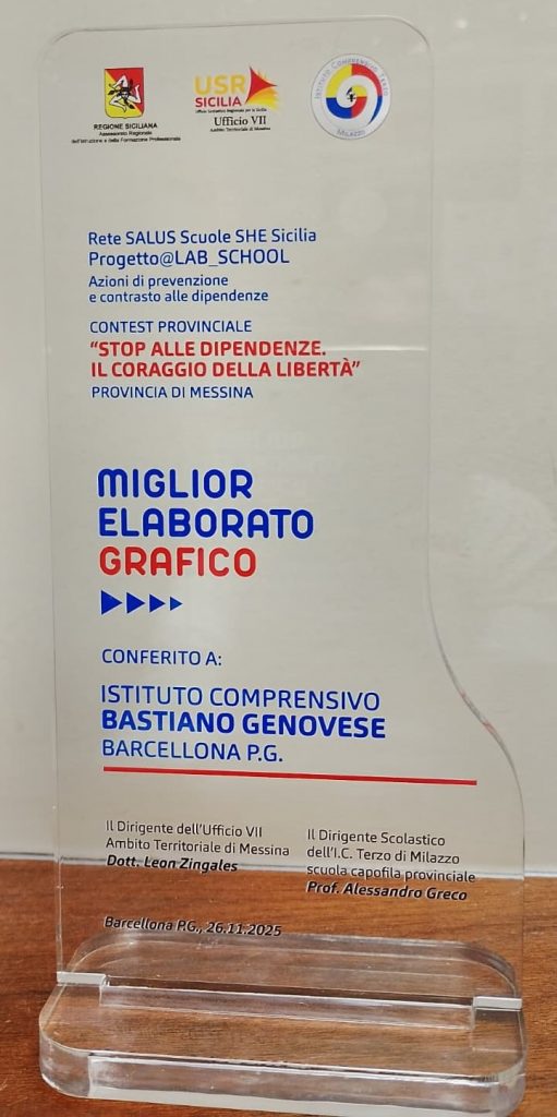 Grande entusiasmo all’Istituto Comprensivo “Bastiano Genovese” di Barcellona P.G. per la vittoria ottenuta al contest “Stop alle dipendenze. Il coraggio della libertà”, iniziativa inserita all’interno del progetto “@ Lab_school. Azioni a contrasto e prevenzione delle dipendenze”, che ha coinvolto scuole di tutta la provincia con l’obiettivo di promuovere consapevolezza, responsabilità e stili di vita sani.