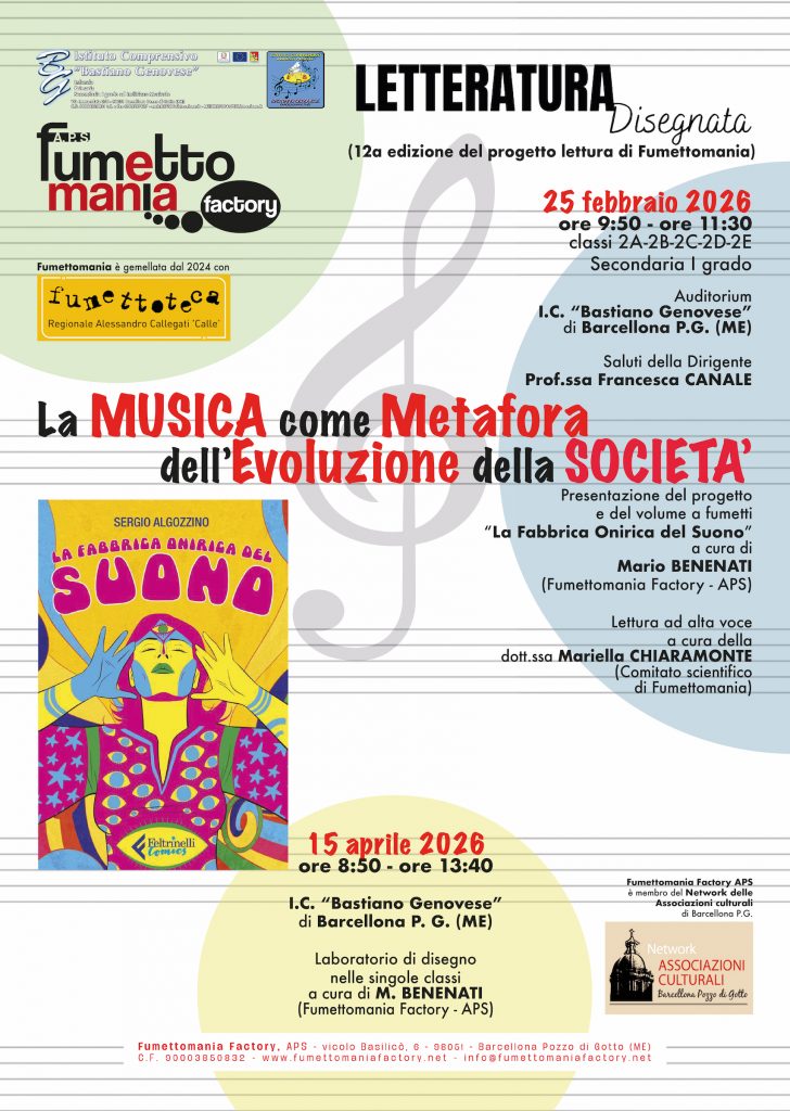 Non è solo lettura, è una sinfonia cross-mediale che attraversa la storia d’Italia. L’associazione Fumettomania Factory APS ha svelato le rotte per il 2026, mettendo in campo una scommessa ambiziosa che unisce la nona arte alla musica. Il cuore pulsante della nuova programmazione sarà il progetto “La Musica, come metafora dell’evoluzione della società”, che debutterà il prossimo 25 febbraio presso l’I.C. “Bastiano Genovese”.