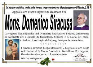 La Celebrazione Esequiale per Mons. Domenico Siracusa sarà presieduta dall’Arcivescovo Mons. Giovanni Accolla, alle ore 10.00 di domani mercoledì 2 luglio 2025, nel Duomo di S. M. Assunta di Pozzo di Gotto, quella che fu la sua parrocchia dal 1 febbraio 1984 al 29 ottobre 2011.