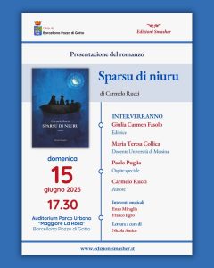 Appuntamento con la cultura domenica 15 giugno 2025 a Barcellona Pozzo di Gotto: le Edizioni Smasher hanno il piacere di presentare il nuovo libro di Carmelo Rucci dal titolo “Sparsu di niuru”. L’evento prenderà il via alle ore 17.30 presso l’Auditorium del Parco Urbano “Maggiore Giuseppe La Rosa”.