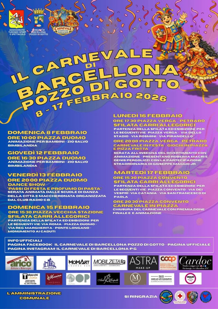Un Carnevale 2026 tutto da vivere quello di Barcellona Pozzo di Gotto, ormai da anni fra i più partecipati e spettacolari di Sicilia. Che si aprano le danze…