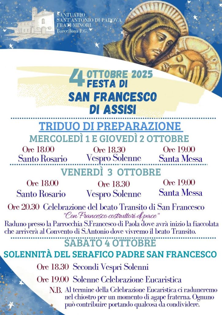 Sabato 4 ottobre 2025 la Chiesa festeggia il Patrono d’Italia San Francesco d’Assisi ed anche Barcellona vivrà questa ricorrenza con fede e fervore, a partire da questa sera, quando, si terrà il “Transito di San Francesco” presso il Convento Santuario di Sant’Antonio di Padova.