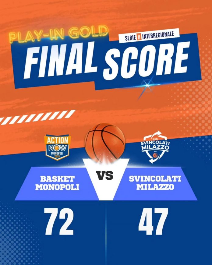 Monopoli – Agli Svincolati Milazzo non riesce l’impresa a Monopoli, uscendo sconfitta 72-47 in terra pugliese, ma i mamertini escono a testa alta perché nonostante la sconfitta centrano l’obiettivo stagionale e cioè l’accesso ai playoff, dove affronterà nel primo turno la Basket School Messina.