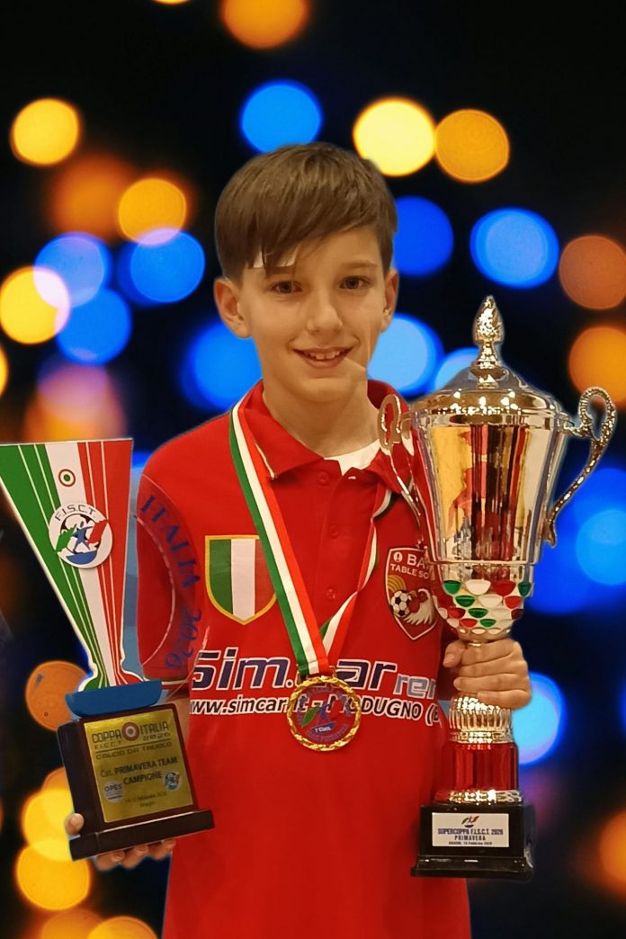formazione pugliese ha messo in bacheca prima la Coppa Italia, superando in finale il Real Montesilvano al termine di una sfida intensa ed equilibrata, poi ha completato l’opera conquistando anche la Supercoppa italiana contro il Subbuteisti Modena, in un’altra gara risolta nei momenti decisivi. Due successi arrivati con carattere, freddezza e una compattezza di squadra che ha fatto la differenza. Il palcoscenico dell’evento è stato il Palazzetto Tiziano Ciotti, trasformato per l’occasione in una vera arena del calcio da tavolo giovanile. Per due giorni il parquet ha ospitato entusiasmo, tensione agonistica e scene di gioia incontenibile, con i giovani atleti protagonisti di un confronto tecnico di alto livello. Guidati dal capitano e responsabile del settore giovanile Cecco Colossi, i “Piccoli Galletti” hanno mostrato solidità e spirito di squadra. Oltre a Rossitto, decisivo l’apporto di Daniele Salatino, Antonio Martinelli, Simone Roberto e Mattia Loseto. Un gruppo coeso, in cui talento individuale e lavoro collettivo si sono fusi alla perfezione, confermando la qualità del vivaio barese, capace di imporsi per il secondo anno consecutivo ai vertici nazionali. Per Aleksandar Rossitto si tratta della conferma di un percorso di crescita costante. Arrivato al Bari TS due anni fa, aveva già contribuito alla conquista degli stessi titoli nella stagione precedente.