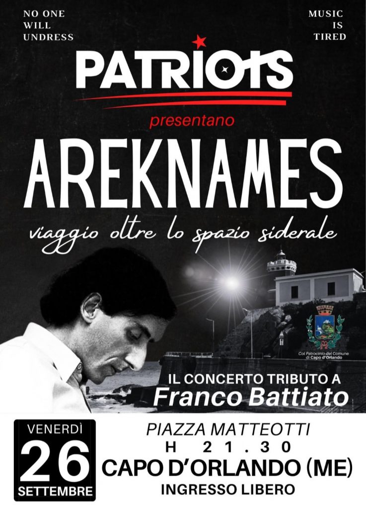 Venerdì 26 settembre 2025 alle ore 21:30 nella centralissima Piazza Matteotti a Capo d’Orlando, si terrà «Areknames – Viaggio oltre lo spazio siderale», il concerto tributo al grande Maestro Franco Battiato. L’evento, a titolo gratuito, vedrà sul palcoscenico i Patriots, una tribute band formata da giovani musicisti siciliani, che intende omaggiare la personalità musicale, intellettuale e umana di uno dei più grandi artisti della musica italiana.