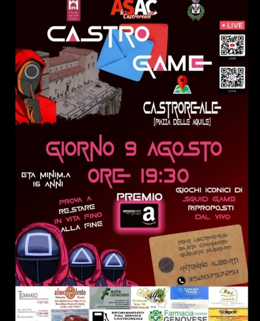 Sabato 9 agosto 2025 a partire dalle ore 19.30 si terrà in Piazza delle Aquile nel borgo di Castroreale, l’evento intitolato “CASTRO GAME” organizzato da ASAC Castroreale con l’obiettivo di offrire un’esperienza unica, dinamica e immersiva dedicata ai giovani del territorio.