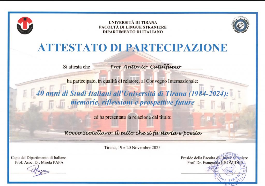Continuano gli impegni internazionali di Antonio Catalfamo, docente universitario, critico, scrittore e poeta barcellonese. Recentemente è stato chiamato a relazionare al Convegno scientifico internazionale svoltosi a Tirana sul tema «40 anni di Studi Italiani all’Università di Tirana (1984-2024): memorie, riflessioni e prospettive future», organizzato dal suddetto ateneo (vedi foto) in collaborazione con l’Istituto Italiano di Cultura e con L’Ambasciata Italiana a Tirana, presso la Facoltà di Lingue Straniere.