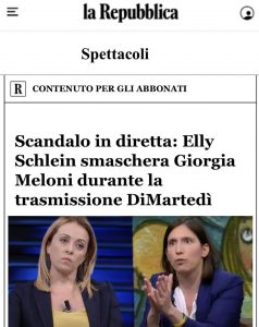 È presentato così “Scandalo in diretta: Elly Schlein smaschera Giorgia Meloni durante la trasmissione DiMartedì” il post che gira su Facebook, con protagonisti la Presidente del Consiglio, la segretaria PD e il giornalista conduttore televisivo Giovanni Floris.