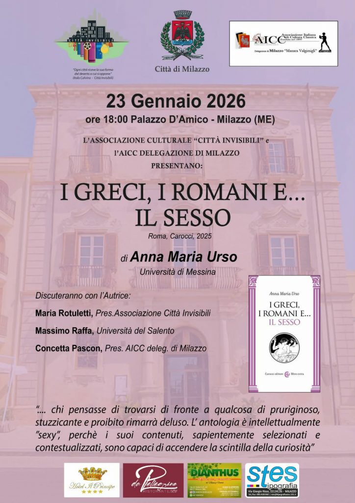 ​Venerdì 23 Gennaio 2026, alle ore 18:00, la splendida cornice del Piano Nobile di Palazzo D’Amico a Milazzo ospiterà un viaggio affascinante tra le pieghe della storia antica. Protagonista della serata sarà la Prof.ssa Anna Maria Urso, Ordinaria di Filologia Classica presso l’Università degli Studi di Messina, che presenterà la sua ultima fatica letteraria: ​”I Greci, i Romani e… il Sesso”.