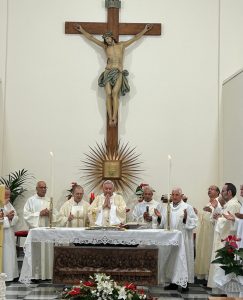 Lo ha fatto, nell’omonima chiesa, con una solenne liturgia celebrata da P. Merlino, insieme a mons. Farsaci, P. Antonino Pelleriti, P. Francesco De Domenico e P. Francesco Arena, con il servizio all’altare di diaconi e ministranti, nella quale tutti hanno pregato anche per la salute del parroco.