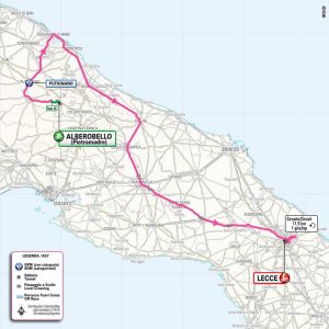 La tappa partirà da Alberobello, Patrimonio dell’Umanità UNESCO e celebre in tutto il mondo per i suoi trulli, antiche costruzioni coniche in pietra che rappresentano uno dei simboli più riconoscibili del Sud Italia. Da lì, i corridori inizieranno un percorso che mescola scenari suggestivi e insidie tattiche, anche se l’altimetria sarà decisamente più amica rispetto alle prime giornate. Il primo tratto presenta l’unico Gran Premio della Montagna, situato a Putignano, classificato come GPM di quarta categoria. Nulla di proibitivo, ma potrebbe servire a formare la fuga di giornata. Da qui in poi, il tracciato si farà più lineare e scorrevole, con ampie strade e lievi ondulazioni, perfette per i treni dei velocisti che inizieranno a organizzarsi già a metà tappa. Il primo traguardo volante sarà posizionato a Polignano a Mare, splendida cittadina affacciata sull’Adriatico, famosa per le sue scogliere e