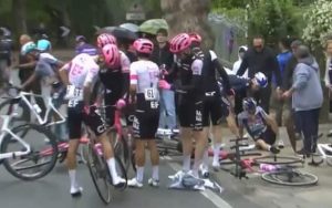 A terra, oltre a Hindley, sono finiti Mads Pedersen, maglia rosa, Adam Yates, Daniel Martinez, Lorenzo Fortunato e Richard Carapaz. Hindley è stato trasportato in ambulanza con una sospetta commozione cerebrale. Pochi minuti dopo è arrivata la conferma del suo ritiro,un colpo durissimo per la BORA-hansgrohe. Vista la gravità della situazione, la direzione del Giro ha dapprima rallentato la corsa e poi deciso di fermarla completamente per permettere i soccorsi e consentire alle ambulanze di liberare la strada. La neutralizzazione è durata una trentina di minuti e ra ripartenza è avvenuta da Nola, a 55 chilometri dal traguardo, con l’accordo unanime di neutralizzare la tappa dal punto di vista della classifica generale. Niente abbuoni, nessun punto, nessun distacco da registrare. Solo la vittoria di tappa sarebbe stata assegnata