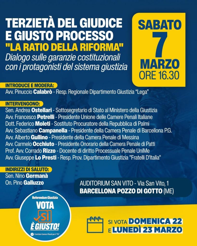 Non si parlerà solo di codici e aule di tribunale: l’incontro si inserisce in un clima di forte fermento politico, con lo sguardo rivolto al prossimo appuntamento referendario sulla separazione delle carriere all’interno della magistratura. I saluti istituzionali saranno affidati al senatore Nino Germanà e al deputato regionale Pino Galluzzo.