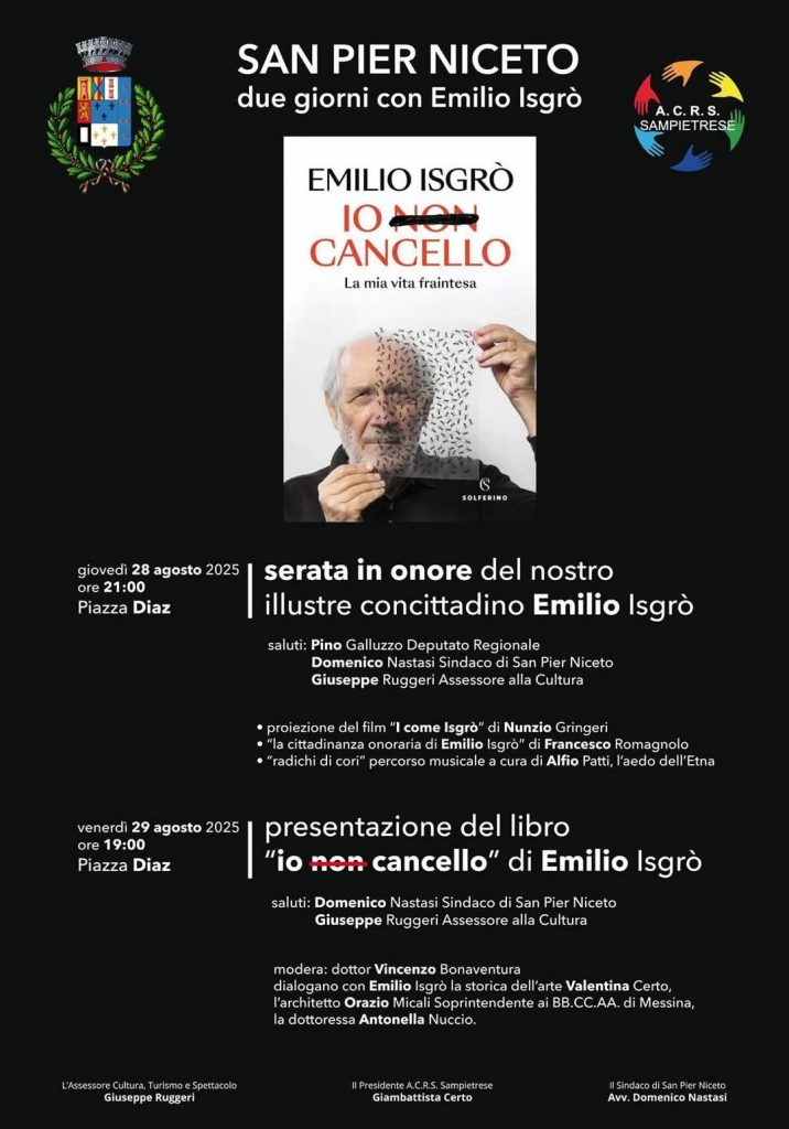 Giovedì 28 e venerdì 29 agosto 2025 il Maestro Emilio Isgrò, artista, scrittore e poeta italiano, conosciuto a livello internazionale per il linguaggio artistico della “Cancellatura”, torna a San Pier Niceto, luogo di nascita dei suoi nonni, dove, nel luglio del 2023, gli fu conferita la Cittadinanza Onoraria.