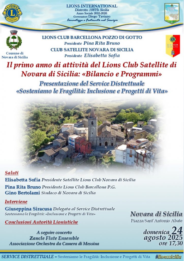 Domenica 24 agosto 2025 alle ore 17.30 in Piazza Sant’Antonio a Novara di Sicilia, si terrà un importante evento nel corso del quale verranno tracciati bilancio e programmi del primo anno di attività del Lions Club Satellite Novara di Sicilia, composto dalla Presidente Elisabetta Sofia affiancata da Alfredo Anselmo, Marilena Da Campo, Maria Pagano, Antonio Pettineo, Giuseppe Puglisi e Rosalba Rossello.