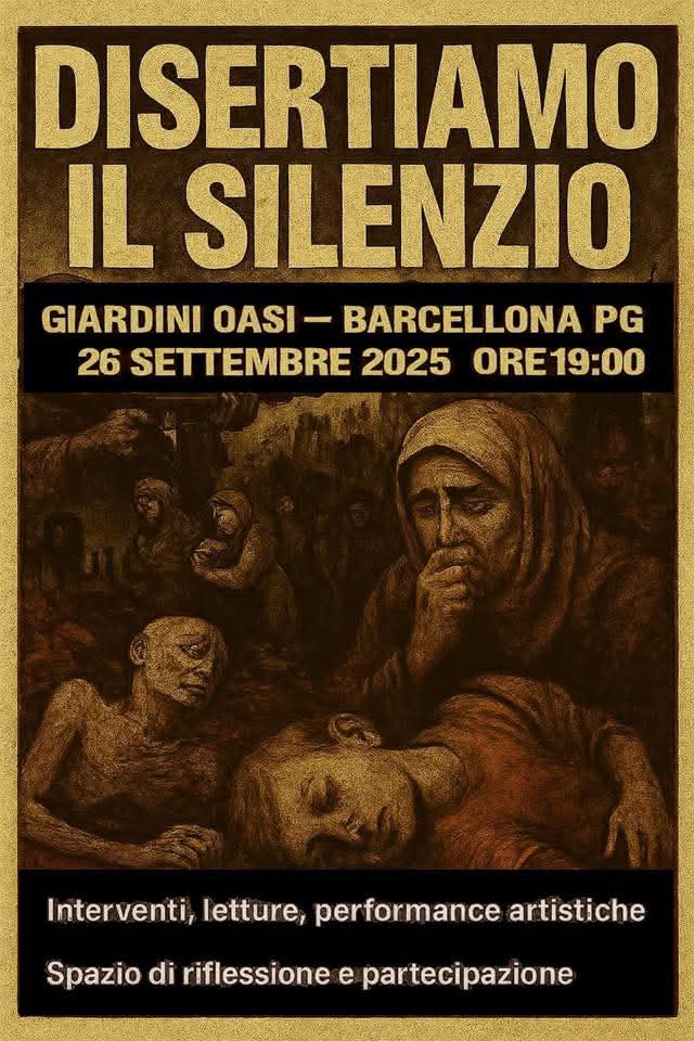 Si terrà venerdì 26 Settembre 2025 nei Giardini Oasi Piazza San Sebastiano, l’evento “Disertiamo il Silenzio”, che non vuole significare altro che “basta stare zitti”, “basta essere passivi”: disertiamo tutti insieme il silenzio con le parole, con le testimonianze.