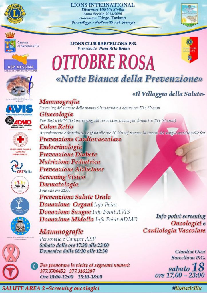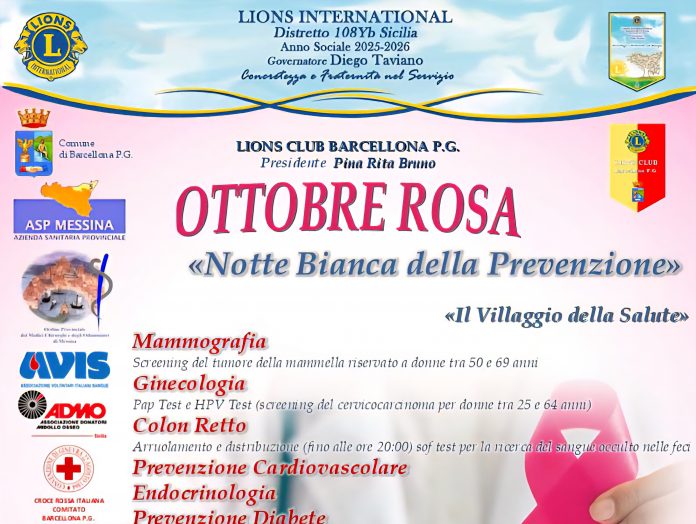 Sabato 18 ottobre, dalle ore 17.00 alle 23.00, ai Giardini Oasi, si terrà la “Notte Bianca della Prevenzione”, iniziativa promossa dal Lions Club di Barcellona Pozzo di Gotto, in collaborazione con l’Azienda Sanitaria Provinciale di Messina, l’Amministrazione Comunale e numerose associazioni del territorio. L’evento, gratuito e aperto a tutta la cittadinanza, nasce con l’obiettivo di diffondere la cultura della prevenzione sanitaria, offrendo l’opportunità di effettuare screening medici gratuiti in diverse specialità.