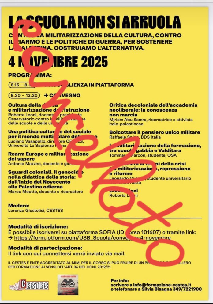 Il Ministero dell’Istruzione e del Merito ha annullato il corso che il Cestes insieme all’Osservatorio contro la militarizzazione nelle scuole e nelle Università ha organizzato per il 4 novembre 2025 (Giornata dell’unità nazionale e delle forze armate) con il titolo: “4 novembre la scuola non si arruola”.