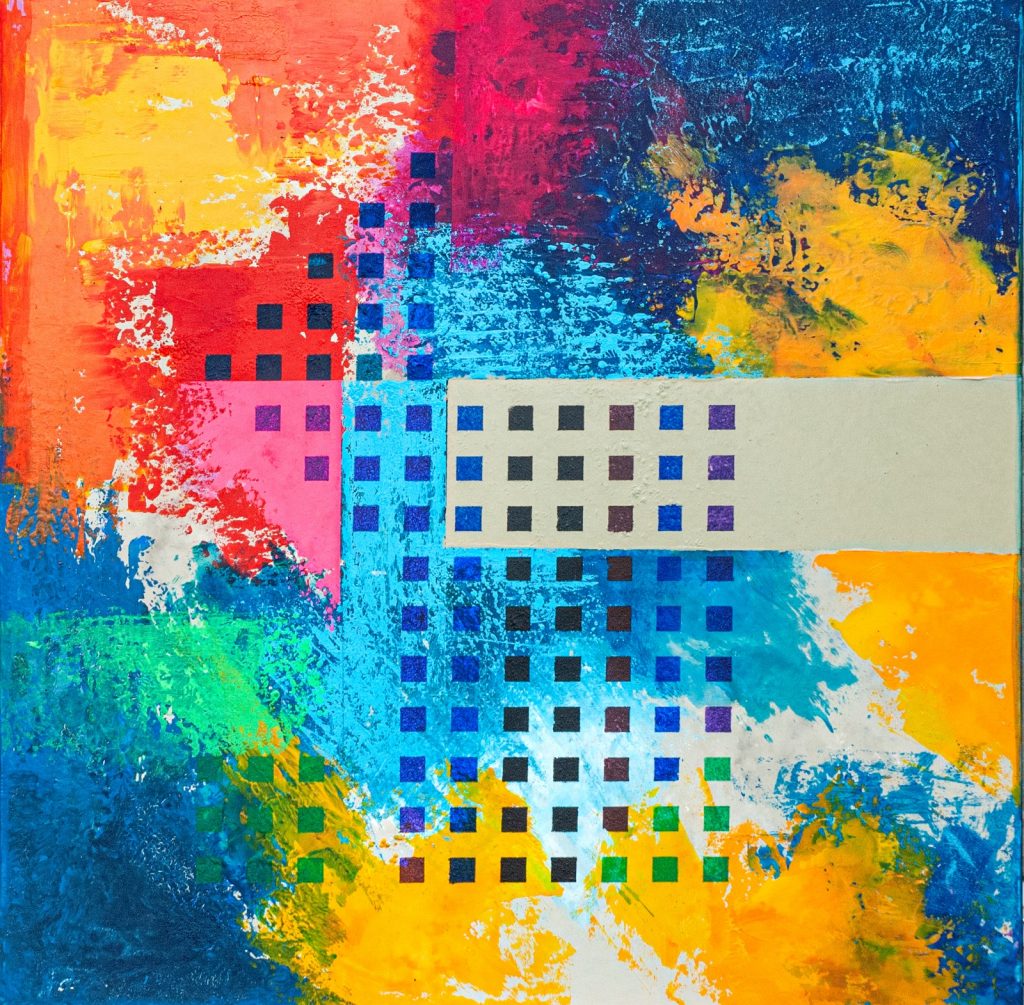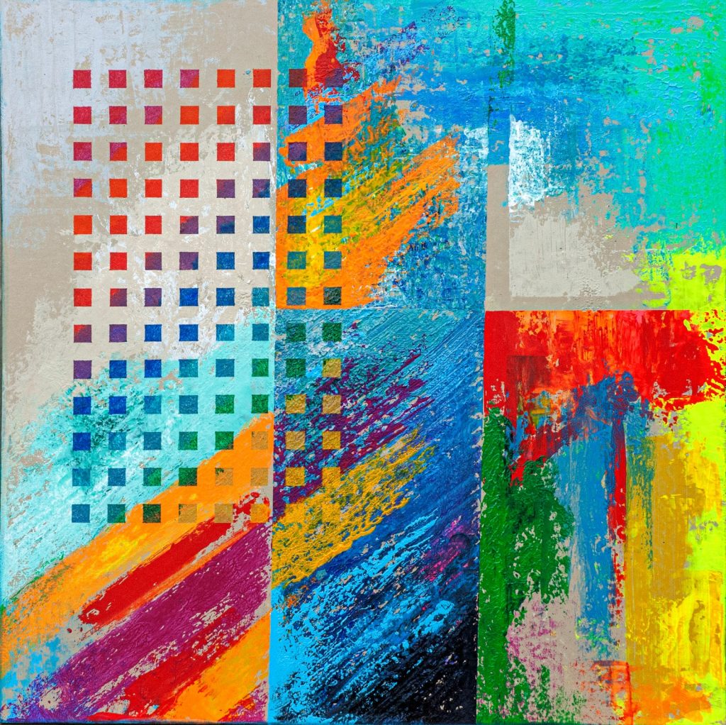 Bavastrelli, noto per coniugare sapientemente i linguaggi dell’Astrazione, firma una pittura gestuale e, al contempo, concettuale. In “Geometrie Illogiche”, l’artista oppone l’esplosione cromatica e materica dello sfondo all’ordine rigoroso di una griglia di quadrati, creando una tensione visiva che indaga la razionalità nel caos emotivo. In “Caos Trasversale”, invece, enfatizza questo conflitto con una composizione divisa in quadranti in cui nell’energia delle pennellate materiche si intersecano brutalmente pattern geometrici. Il dipinto è metafora visiva della difficoltà di strutturare l’instabilità del mondo interiore.