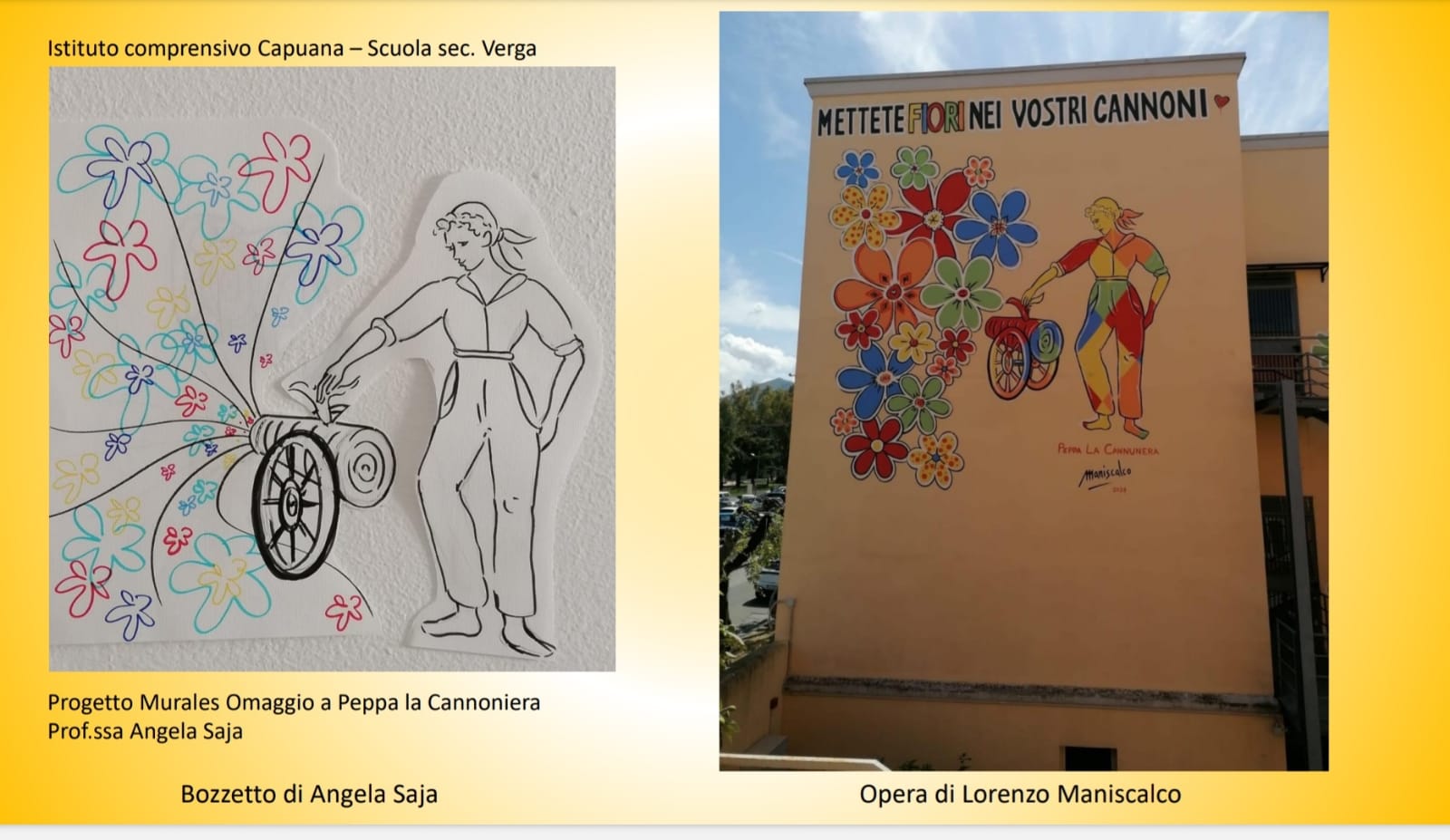 L’intervento della Prof.ssa Angela Saja al Convegno “DONNE PROTAGONISTE NELLA STORIA: omaggio a Peppa la Cannoniera, eroina risorgimentale”,  (oltre a delineare il progetto, da lei proposto volto alla Legalità e all’Educazione Civica, Murales Monumento “Peppa la Cannunera: Mettete fiori nei vostri cannoni” dell’I. C. Capuana Scuola Verga diretto dalla Dott.ssa Carmela Pino) ha posto l’attenzione sull’Arte celebrativa dei MONUMENTI – Statue e Murales – DEDICATI ALLE DONNE negli spazi pubblici delle nostre città da Sud a Nord, donne realmente esistite e che hanno attivamente contribuito alla nostra Storia, allo sviluppo economico, politico, sociale, culturale, scientifico e artistico della nostra splendida Italia.