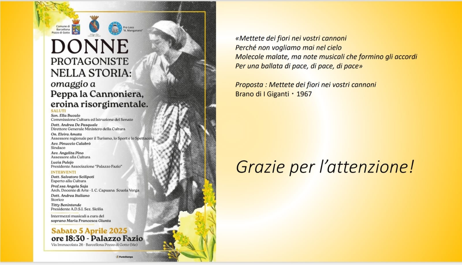 L’evento “DONNE PROTAGONISTE NELLA STORIA: omaggio a Peppa la Cannoniera, eroina risorgimentale” è stato organizzato e curato dall’amministrazione comunale di Barcellona Pozzo di Gotto Sindaco Avv Pinuccio Calabrò, Assessora alla Cultura Avv. ta Angelita Pino, Esperto alla Cultura Dott Salvatore Scilipoti e Associazione culturale Palazzo Fazio Signora Lucia Pulejo, si è tenuto sabato 05.04.2025 a Barcellona Pozzo di Gotto nel suggestivo Palazzo Fazio, elegante Dimora Storica.