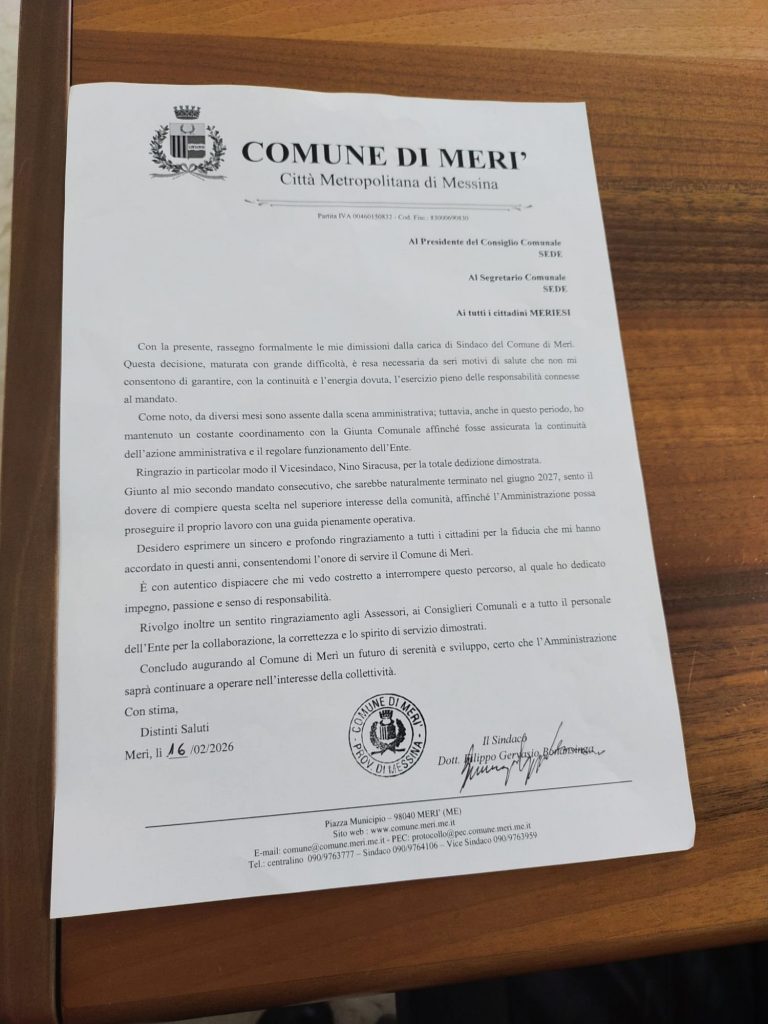 Nella missiva indirizzata al Presidente del Consiglio, al Segretario e a tutti i cittadini meriesi, spicca il ringraziamento speciale al vicesindaco Nino Siracusa, lodato per la “totale dedizione dimostrata” in questo periodo di transizione. Un pensiero è andato anche agli assessori, ai consiglieri e al personale dell’Ente per lo spirito di servizio dimostrato.