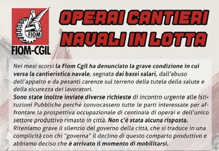 Indetta dalla Fiom Cgil per domani 17 ottobre una manifestazione degli operai dei cantieri navali di Messina, che inizierà alle 10 in piazza Unione Europea, di fronte al Palazzo Municipale.