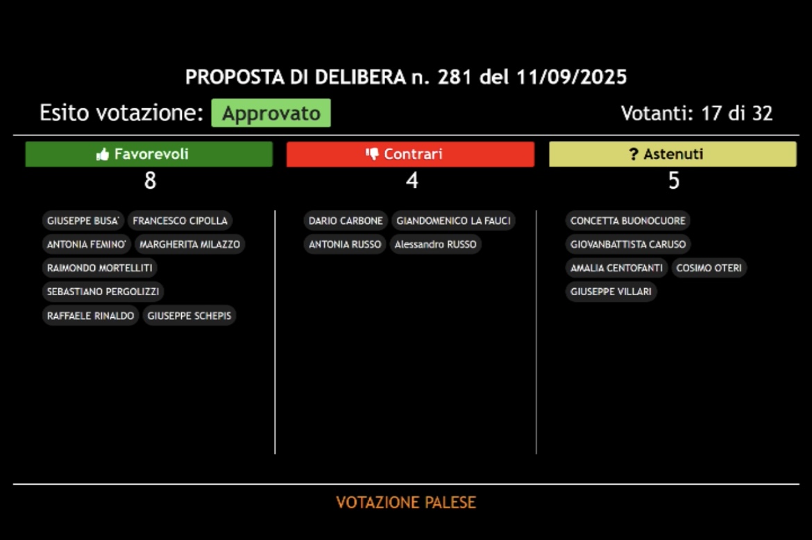 Ed i voti favorevoli sono stati 9, cioè quelli dei consiglieri dei tre Gruppi di maggioranza presenti (Salvatore Caruso con voto nominale a causa di un problema con la scheda), sufficienti all’approvazione solo perché ci sono stati cinque consiglieri astenuti, che a norma di Statuto (art. 55) sono esclusi dal computo pur concorrendo alla formazione del numero legale. Gli unici che hanno espresso voto contrario sono stati: i due consiglieri del PD presenti, Alessandro Russo ed Antonella Russo, Domenico La Fauci di Ora Sicilia e Dario Carbone di FDI.