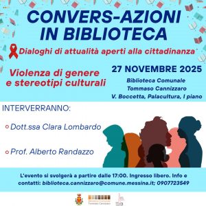 Giovedì 27 novembre, a partire dalle ore 17, presso la Biblioteca comunale “Cannizzaro”, al Palacultura Antonello, si svolgerà il primo incontro del ciclo “Convers-azioni in Biblioteca”, condiviso con l’Assessorato alle Politiche Culturali. Si tratta di dialoghi, aperti alla cittadinanza, con l’obiettivo di discutere insieme di tematiche attuali. Un momento di confronto e di consapevolezza che consentirà, attraverso la presenza di esperti, di approfondire determinati temi e aspetti.