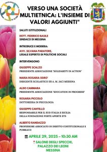 L’Associazione Solidarity in Action con il patrocinio della Città Metropolitana di Messina organizza martedì 29 aprile alle ore 10:30 presso il Salone degli Specchi l’incontro dal titolo “Verso una società multietnica: l’insieme di valori aggiunti”.