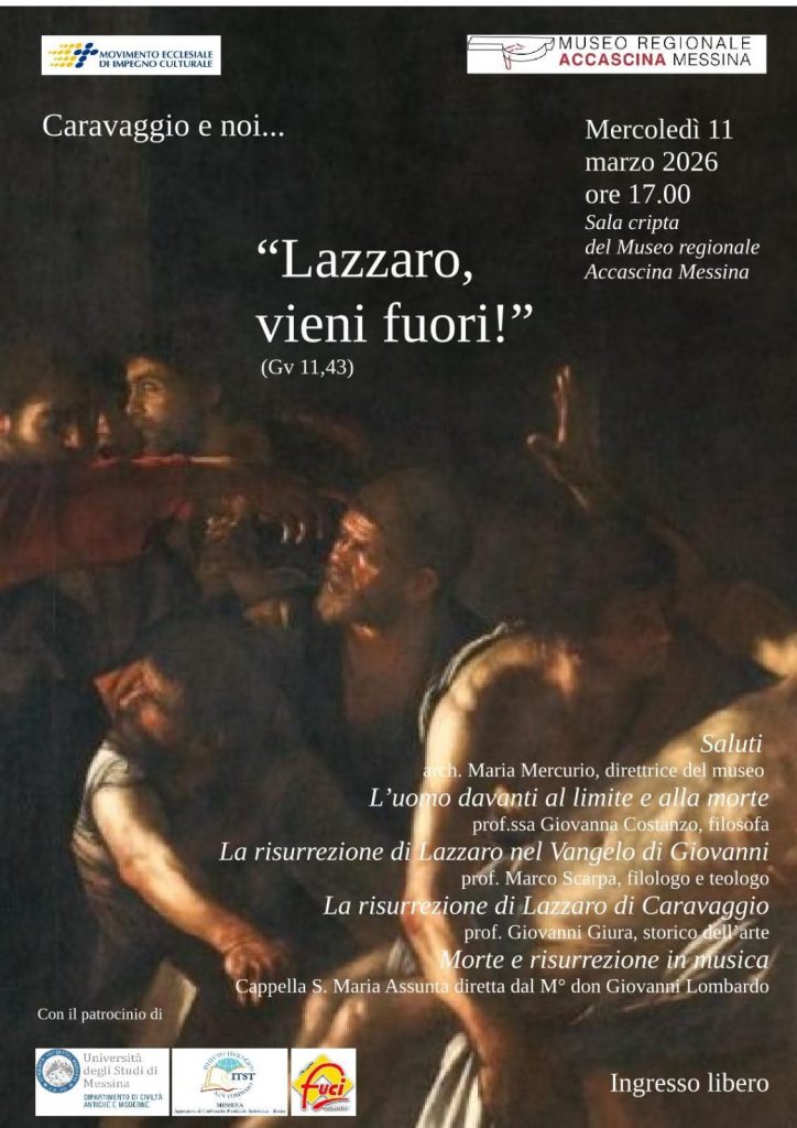 Ieri sera alle h. 17:00, preceduto dai saluti della Direttrice del MuMe Dott.ssa Marisa Mercurio, nella sala cripta del Museo Regionale Accascina di Messina, ha avuto luogo un evento d’alto livello artistico e culturale, perfettamente inserito nel clima quaresimale di questi giorni, in cui si sono confrontati l’Arte e il limite umano primo, ovvero la Morte, limite che Cristo ha oltrepassato con la sua Risurrezione, fatta precedere da Cristo stesso, da quella che lui operò in Lazzaro, riportata dal Vangelo di Giovanni (11,43). L’evento è stato promosso dal Movimento Ecclesiale di Impegno Culturale e patrocinato dall’Università degli Studi di Messina, Dipartimento di Civiltà Antiche e Moderne, dall’istituto teologico ITST e dal FUCI.