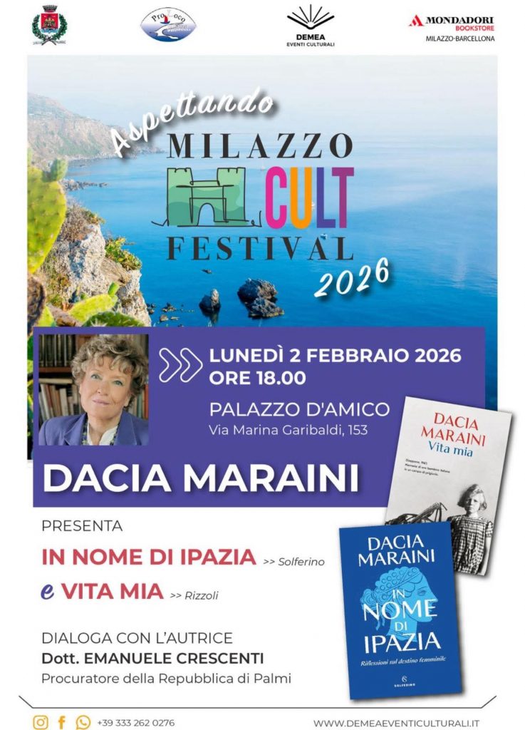 Il prestigio della grande letteratura internazionale sbarca a Milazzo. Lunedì 2 febbraio, alle ore 18:00, la splendida cornice di Palazzo d’Amico ospiterà uno degli appuntamenti più attesi della stagione culturale siciliana: l’incontro con Dacia Maraini.