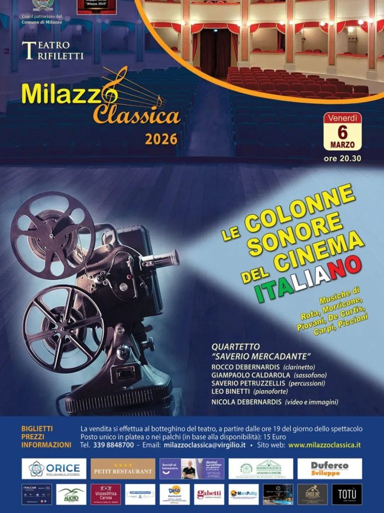 Chi non ha mai chiuso gli occhi lasciandosi trasportare dalle note di un tema immortale? La musica non è solo un sottofondo, ma il battito cardiaco dei nostri ricordi più belli: un amore sbocciato, un momento di pura felicità o il fermo immagine di un film che ci ha cambiato la vita. Venerdì 6 marzo 2026, alle ore 20.30 per Milazzo Classica a cura dei Maestri Elvira Foti e Roberto Metro, il Teatro “Trifiletti” si trasformerà in uno scrigno di emozioni per un viaggio indimenticabile tra le grandi melodie che hanno reso iconico il cinema italiano nel mondo.