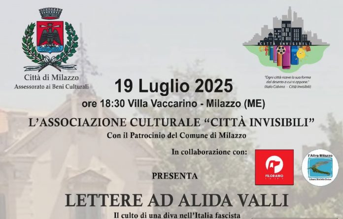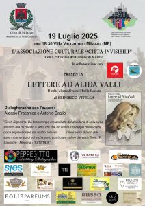 La stagione letteraria estiva dell’Associazione Città Invisibili inizia in collaborazione con la Libreria Filoramo. e l’Associazione L’altra Milazzo, con un gradito ritorno: Federico Vitella con il suo ultimo saggio pubblicato nel 2025: “LETTERE AD ALIDA VALLI, il culto di una diva nell’ Italia Fascista.”