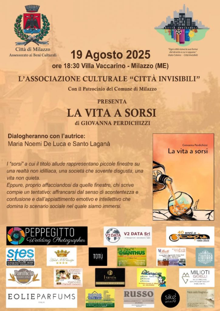 Protagonista sarà Giovanna Perdichizzi, giovane socia dell’ Associazione che, coadiuvata da Memi De Luca e Santo Laganà, presenta il suo secondo lavoro, “La vita a sorsi”, oggi alle ore 18.30 al Giardino Letterario di Villa Vaccarino, a Milazzo.