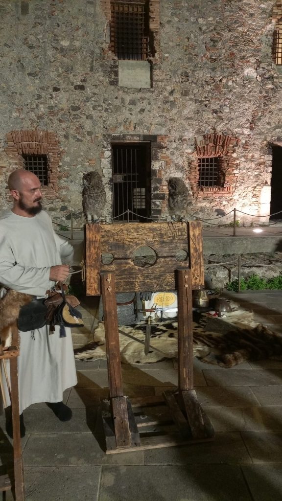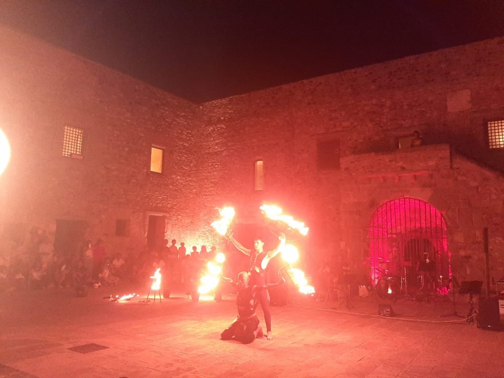 Sulla scia dell’allegria del simpatico giullare, la corte del Castello si fa magica: da Siena arrivano ora gli Artisti del Fuoco, fra danze ed effetti pirotecnici, il duo “La Barraca” da una “idea” artistica di Garcia Lorca, portano il teatro fuori dal teatro…