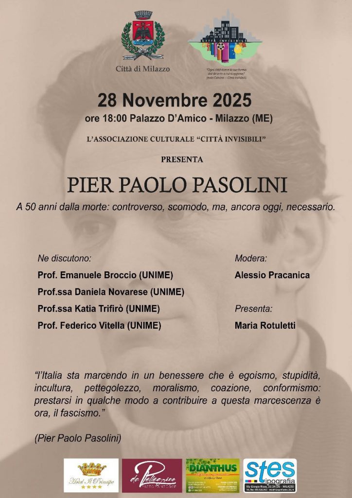 ​L’evento di Milazzo si configura, dunque, non come una semplice celebrazione, ma come un momento di analisi critica e profonda, volta a restituire la complessità di un pensatore che ha saputo anticipare e denunciare le derive della società moderna, rimanendo, a tutti gli effetti, un “intellettuale vero e controverso, scomodo tutt’oggi.” ​L’Associazione “Città Invisibili” invita la cittadinanza, gli studenti e gli appassionati di cultura a partecipare numerosi per non perdere l’occasione di riflettere sull’eredità, ancora viva e pulsante, di Pier Paolo Pasolini.