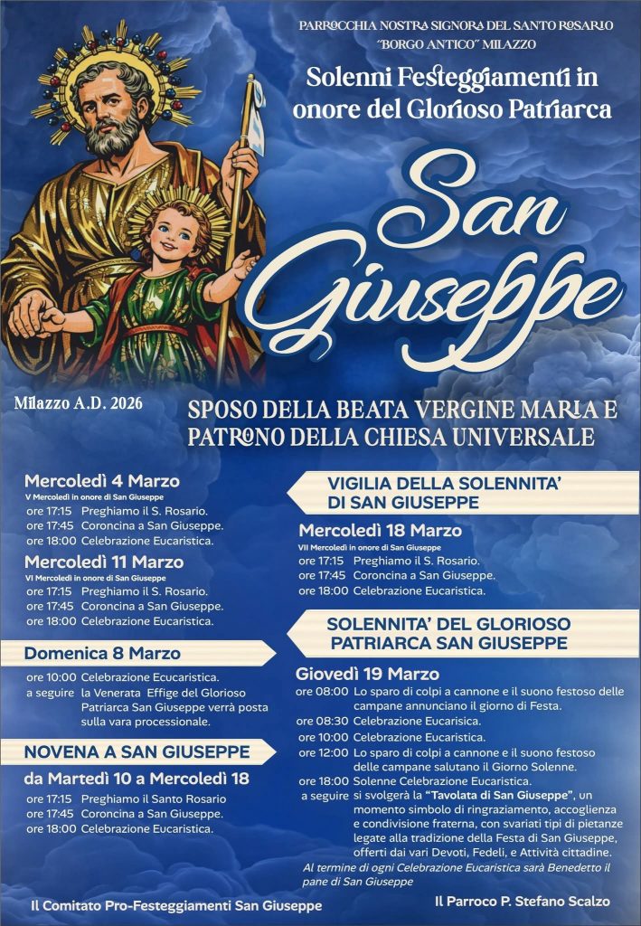 Il Borgo Antico si veste a festa. Con l’arrivo di marzo, la comunità parrocchiale di Nostra Signora del Santo Rosario si prepara a celebrare uno degli appuntamenti più sentiti del calendario religioso mamertino: i solenni festeggiamenti in onore di San Giuseppe, sposo della Beata Vergine e patrono della Chiesa Universale. Un evento che, sotto la guida del parroco Padre Stefano Scalzo e del Comitato Pro-Festeggiamenti, promette di unire generazioni in un abbraccio tra spiritualità e tradizione popolare.